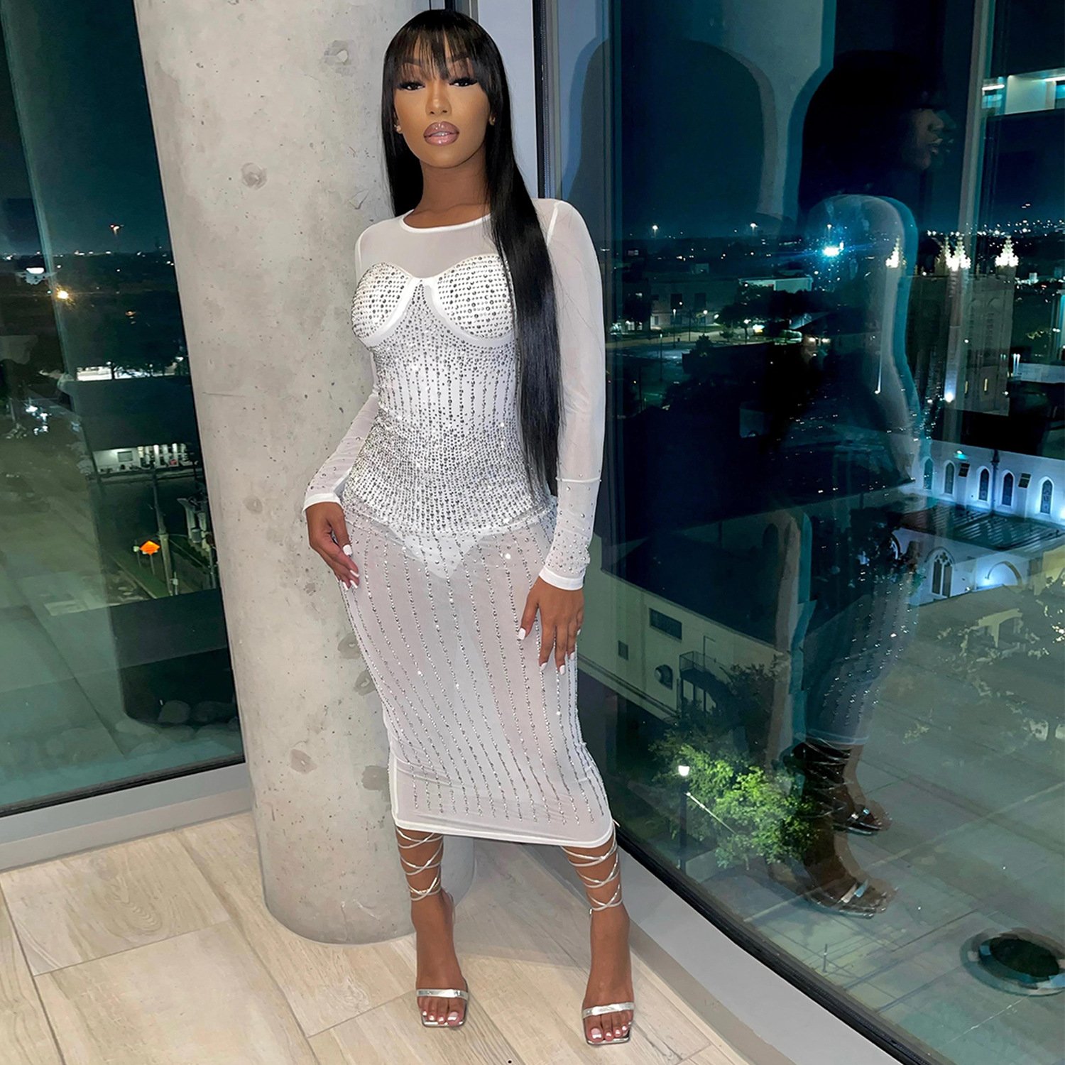 Crafted from high-quality polyester, this dress boasts durability and a soft feel against the skin. The long skirt length adds a graceful touch, making it suitable for both commuting and more formal events. Adorned with exquisite diamonds as a popular element, this jumpsuit is a statement piece that will turn heads.